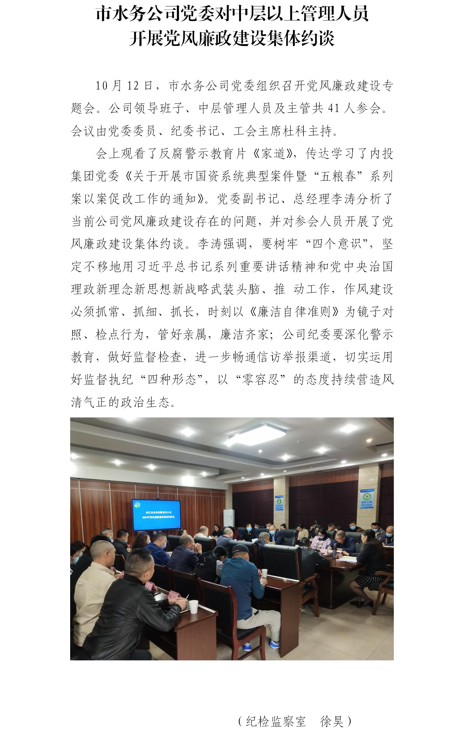 市水務公司黨委對中層以上管理人員開展黨風廉政建設集體約談