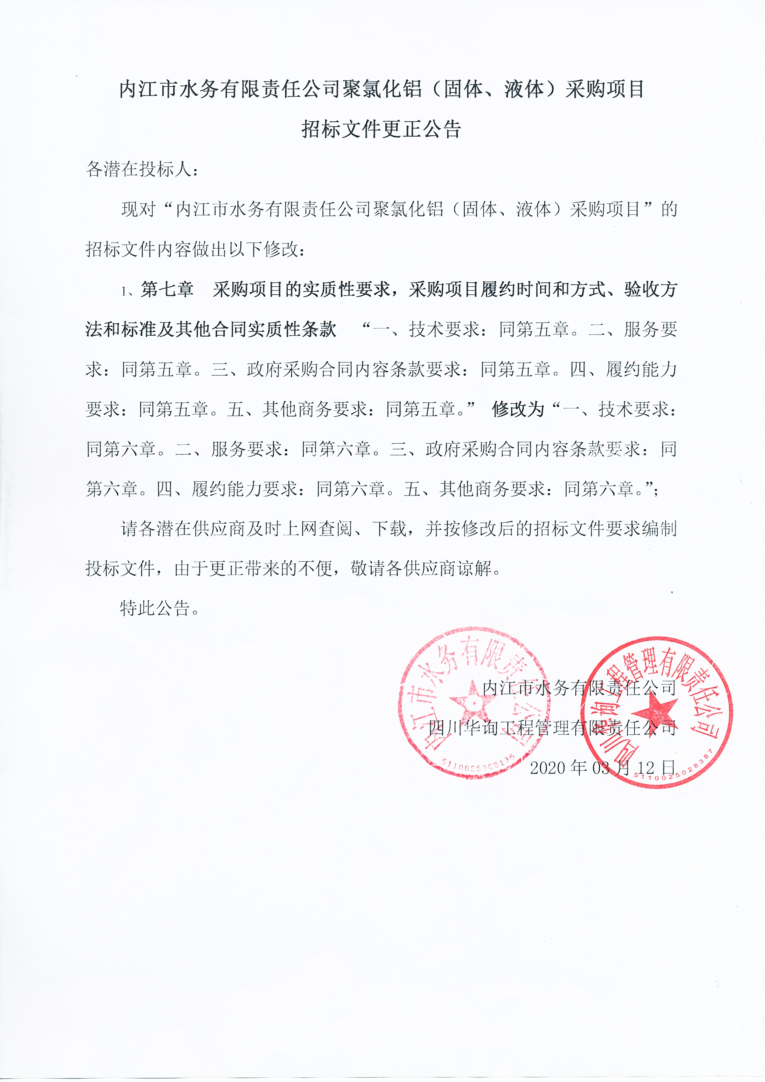 內(nèi)江市水務(wù)有限責任公司聚氯化鋁(固體、液體)采購項目招標文件更正公告