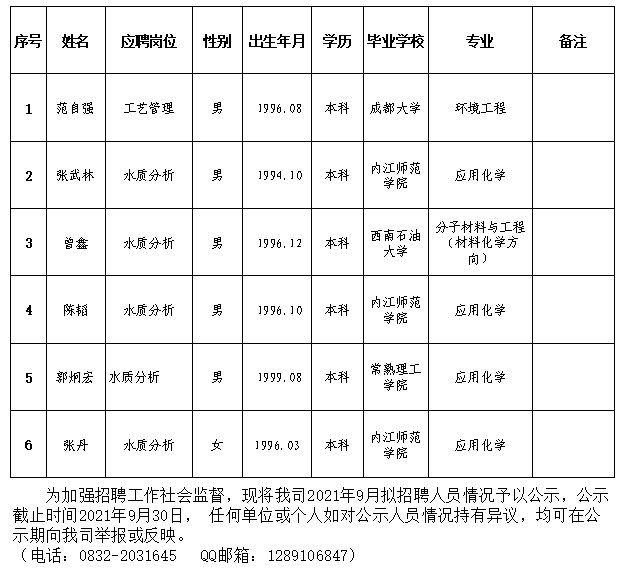 內江市水務有限責任公司2021年9月擬招聘人員公示