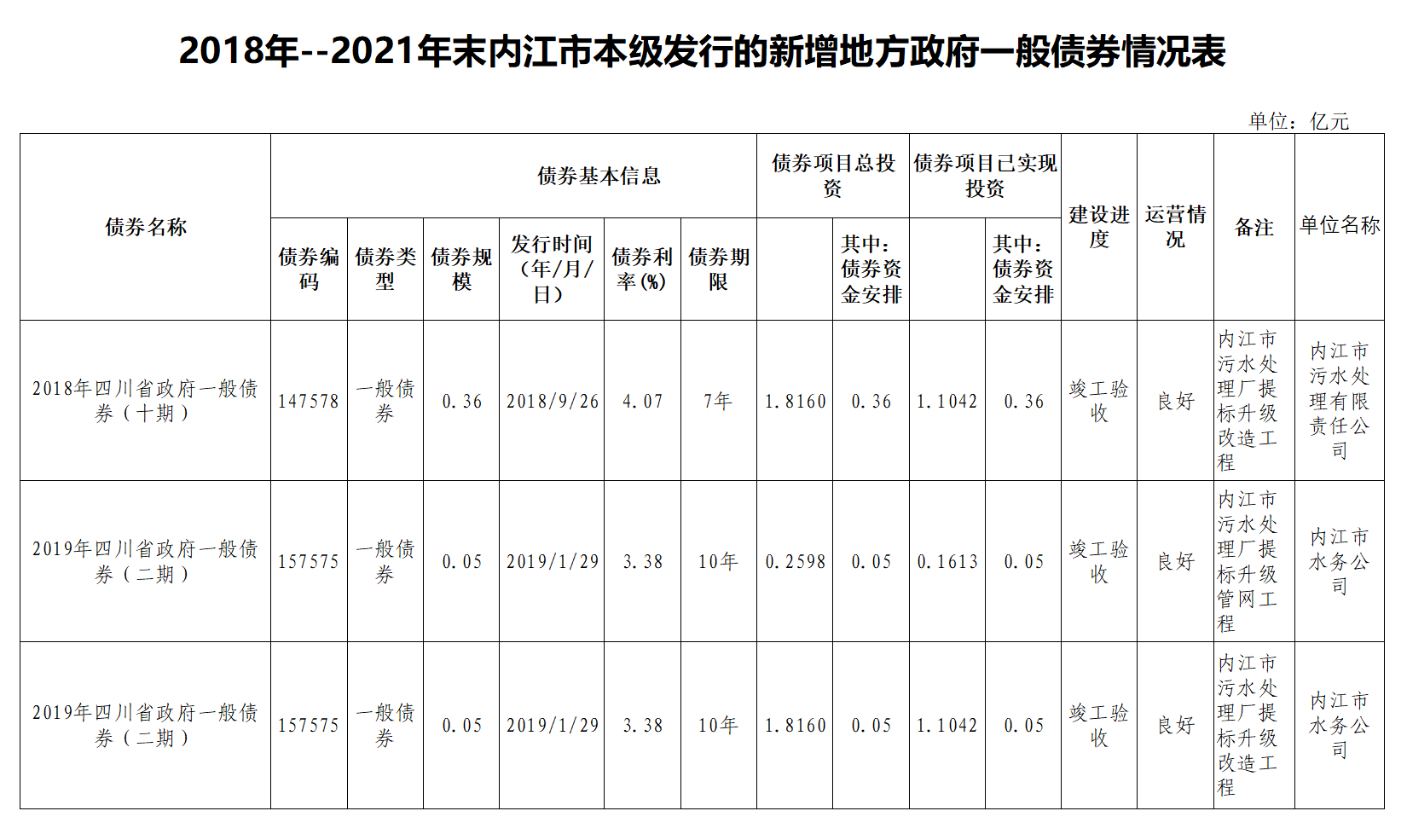 2018年--2021年末內江市本級發行的新增地方政府一般債券情況表