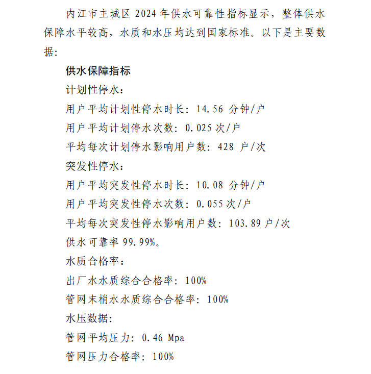 內(nèi)江市水務(wù)有限責任公司供水可靠性保障指標數(shù)據(jù)公示