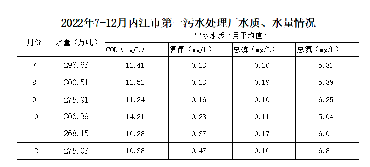 內江市污水處理有限責任公司第一污水處理廠2022年7-12月水量、水質情況