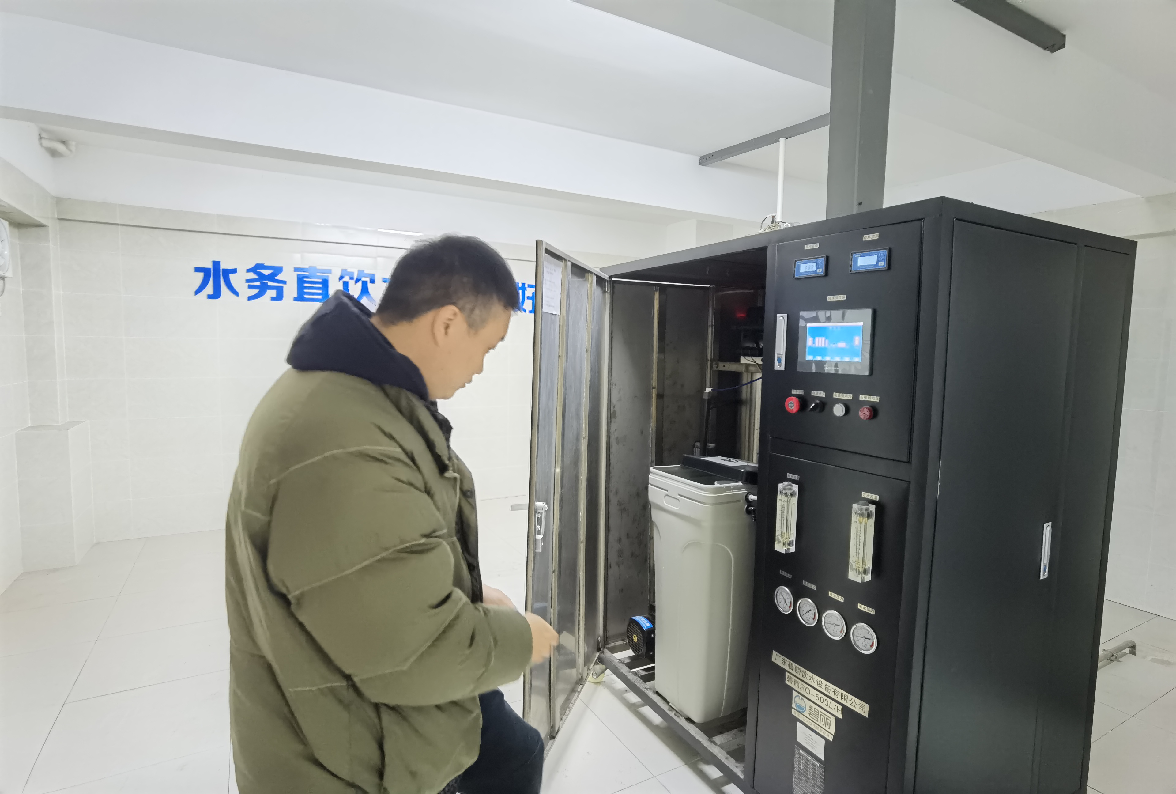 12月25日,豪鵬二次供水公司直飲水設備管理人員李永潔、蒲超前往六中直飲水凈水泵房進行因停電導致設備停機應急處置。