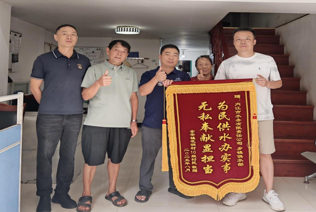 8月25日,花洞村五組村民代表將一面印有“為民供水辦實事 無私奉獻顯擔當”的錦旗贈予鄉鎮供水部,以此表達對部門高效、貼心服務的由衷感激。