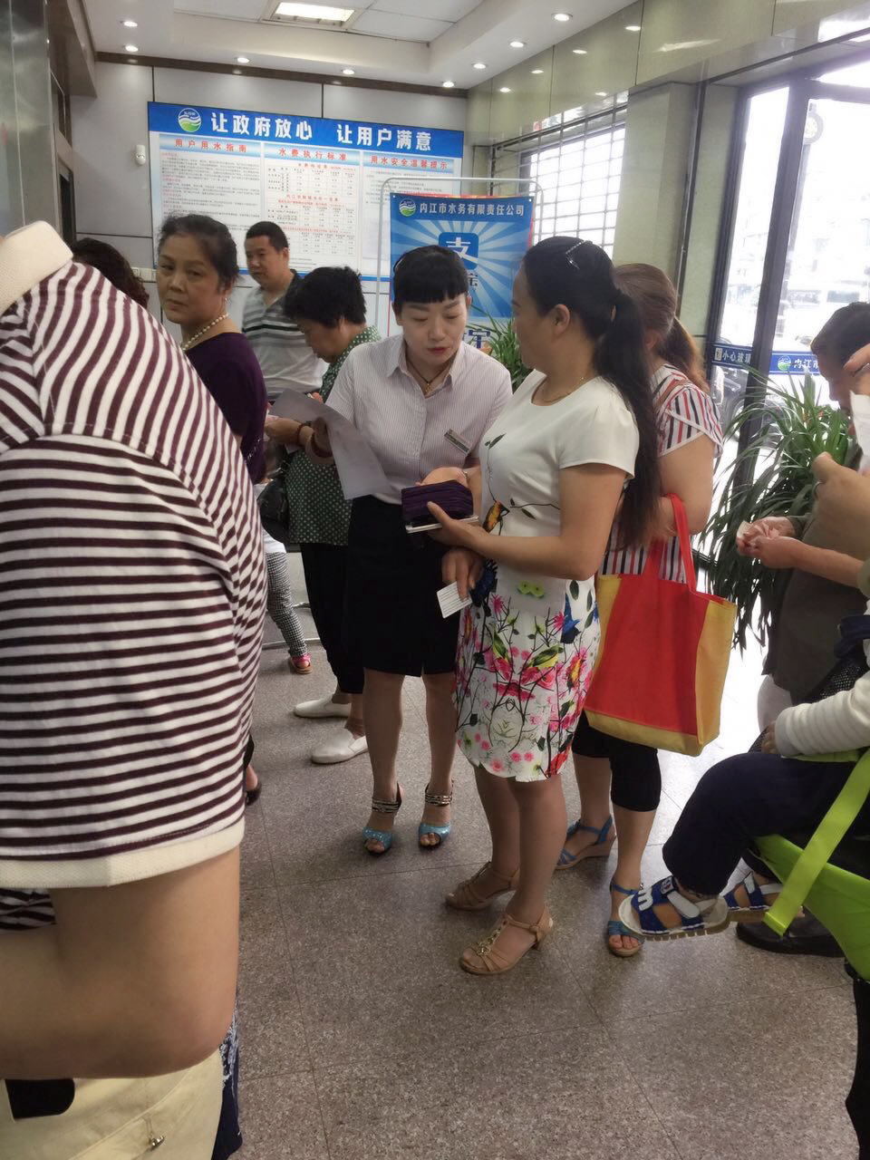 為宣傳推廣公司代收水費業務,公司客戶服務部組織賬務組的工作人員在收費高峰期到每個收費室進行代收費業務的宣傳。工作人員手拿宣傳單走進繳費人群中,熱情仔細給用戶講解水費代收費業務,并用手機手把手教用戶怎么使用翼支付和支付寶手機繳費。通過幫助用戶學習掌握手機繳費,免去用戶在酷暑和寒冬排隊繳費的煩勞。