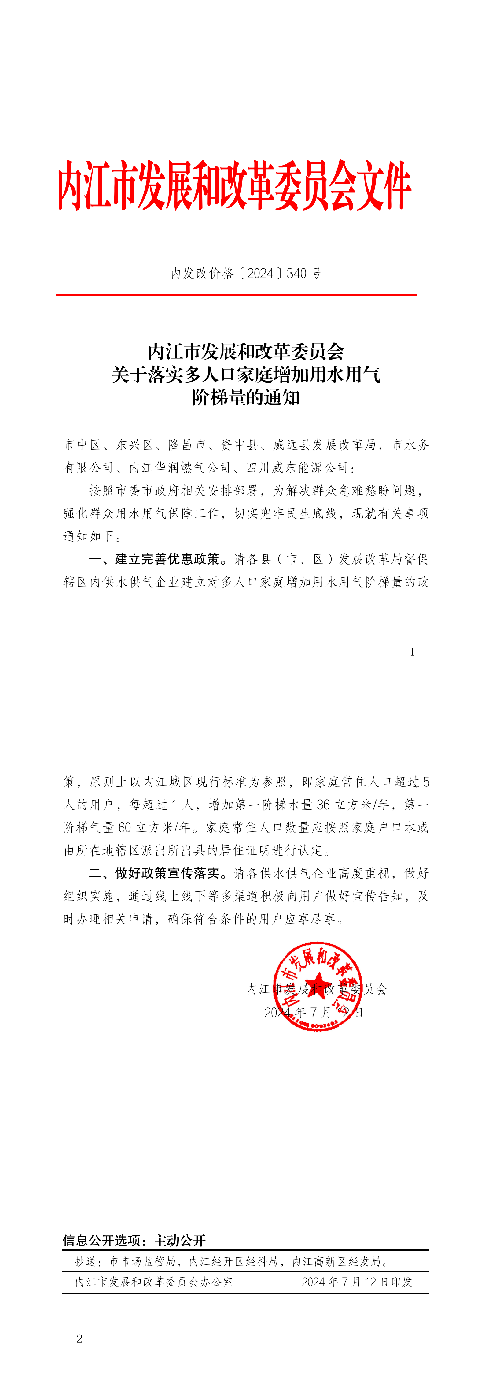 內(nèi)江市發(fā)展和改革委員會關(guān)于落實(shí)多人口家庭增加用水用氣階梯量的通知